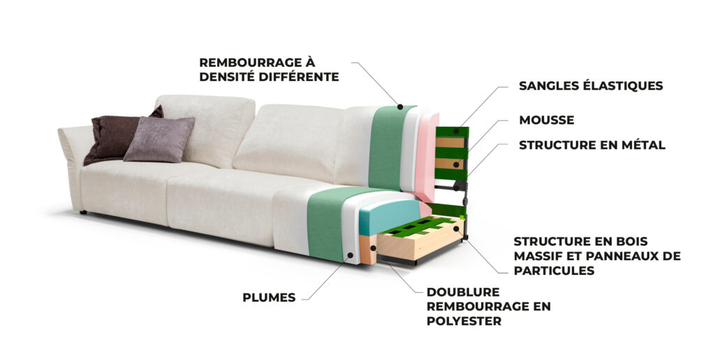 Les structures de nos canapés sont fabriquées à partir d’un choix rigoureux de bois séché et de panneaux agglomérés, sélectionnés pour garantir solidité et résistance aux sollicitations dans le temps. Tous les matériaux sont soumis à des tests rigoureux afin d’évaluer leurs performances dans différentes conditions environnementales et lors d’une utilisation prolongée.