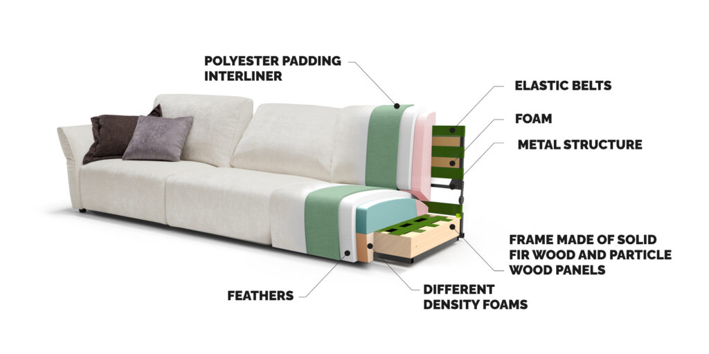 I telai dei nostri divani sono realizzati con una selezione accurata di legno stagionato e pannelli in agglomerato, scelti per garantire solidità e resistenza alle sollecitazioni nel tempo. Tutti i materiali vengono sottoposti a test rigorosi per verificarne le prestazioni in diverse condizioni ambientali e durante l’uso prolungato.